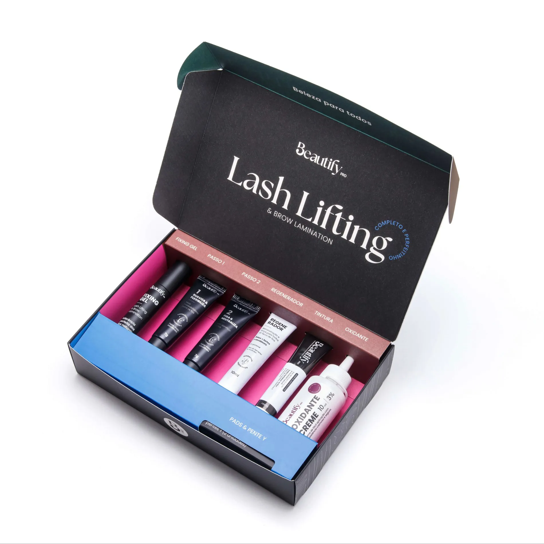 O Kit Lash Lifting & Brow Lamination Beautify Pro foi desenvolvido para profissionais que desejam oferecer curvatura perfeita aos cílios e sobrancelhas alinhadas com acabamento natural. Com aplicação simples e segura, o kit garante resultados duradouros e fios nutridos, com efeito de até 7 semanas.
